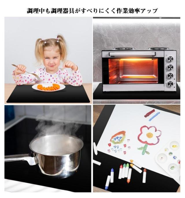| 敷くだけで、調理台をキズや汚れから保護するシリコン製のマット。【59x81cm】 抗菌仕様で衛生的。 調理中も調理器具がすべりにくく作業効率アップ。 耐熱温度230℃なので熱をブロック。 ハサミやカッターで好きなサイズにカットできます。 食器や調理器具のガチャガチャ音を軽減。 丸めて収納できるから場所も取らない! | |