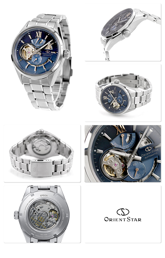 正規品 7年保証キャンペーン 送料無料 オリエントスター 数量限定 オープンハート メンズ 腕時計 RK-AV0132L ORIENT STAR Contemporary Modern Skeleton ネイビー ◆オリエントスターは、1950年のオリエント創業と同時に輝ける星として生まれた代表的なブランドにふさわしく、歴史に裏付けされた技術と、ディテールにまで配慮した粋なデザインの機械式時計を展開。ベーシックモデルからハイスペックモデルまで多彩なラインナップが魅力です。 デザインテーマは、「雪明り」。積もった雪の反射によって夜も周囲が薄明るく見える様子をブルーの濃淡で文字版に表現しています。地面に積もった雪から光が反射して下側が明るくなっている様子を、文字板のブルーグレー+上半分が濃いネイビーのグラデーションで塗装され「静かに流れる時間」を表現。明暗のニュアンスが穏やかで美しい冬の雪景色を表現し、絵画のような情景の中で静かに流れる時間を表現しています。 発売日:2025年9月発売 機械式腕時計