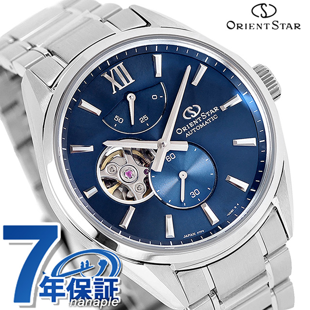 正規品 7年保証キャンペーン 送料無料 オリエントスター オープンハート メンズ 腕時計 RK-BY0010L ORIENT STAR Contemporary Collection M34 F7 Semi Skeleton ネイビー ◆オリエントスターは、1950年のオリエント創業と同時に輝ける星として生まれた代表的なブランドにふさわしく、歴史に裏付けされた技術と、ディテールにまで配慮した粋なデザインの機械式時計を展開。ベーシックモデルからハイスペックモデルまで多彩なラインナップが魅力です。 2024年春夏発売のF7セミスケルトンの追加モデル。文字盤には、ペルセウス座流星群を想起させる美しい放射模様を施し、クリア塗装(ラッピング加工)された文字板は瑞々しく奥深い夜空をイメージしています。2枚構造のダイヤルが立体感を演出しながらダイヤル全体がシンプルなデザインでワントーンになることで、着用シーンを選ばない幅広いスタイルに合わせやすいデザインに。 発売日:2025年9月発売 機械式腕時計
