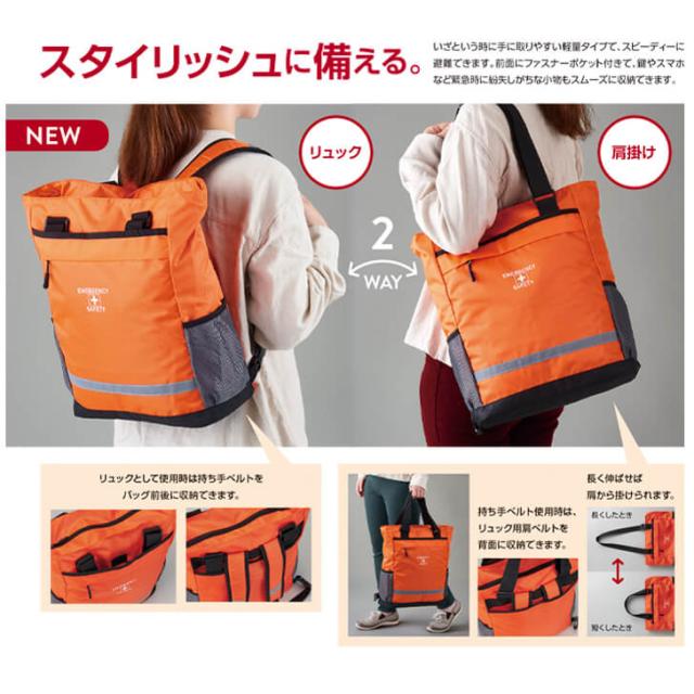 肩掛けトートも出来る2WAY仕様の避難用リュックに、各種防災グッズをセット。