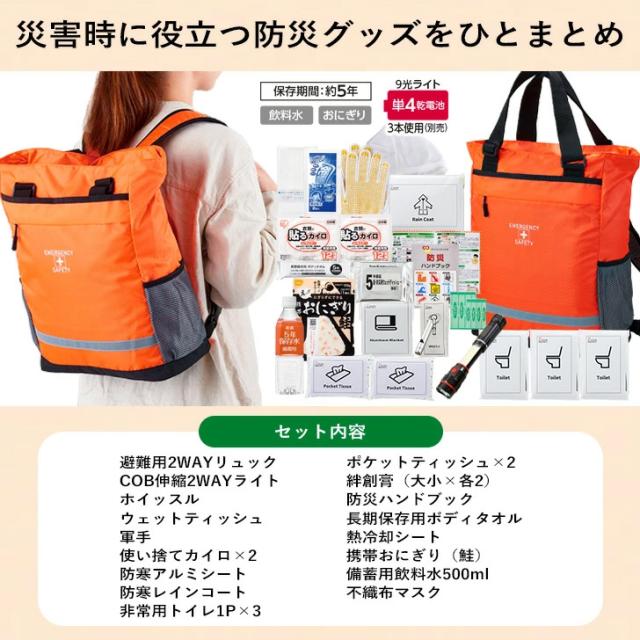 避難用2WAYリュック、COB伸縮2WAYライト、ホイッスル、ウェットティッシュ(20枚)、軍手、使い捨てカイロ×2、防寒アルミシート、レインコート、携帯トイレ(大小兼用)1P×3、ポケットティッシュ×2、エイトバン(大小×各2)、防災ハンドブック、長期保存ボディタオル、熱冷却シート(2枚入)、携帯おにぎり(鮭)、備蓄用飲料水500ml、マスク