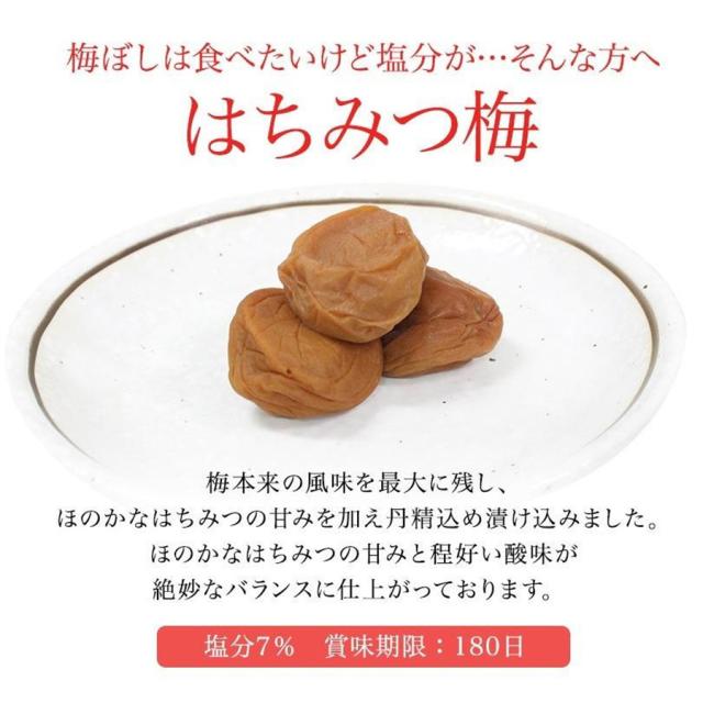 - 何時もはチソ漬け梅干しが好きなのですが、今回お買得だってので塩分7%のハチミツと書いて有ったのですが買って見ました。心配した甘さはそれ程では無くる良かったです。つぶれていましたが大きくて柔らかくて食べ...