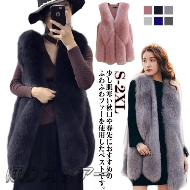 フェイクファー ファーコート 大きいサイズ 羽織り ファーベスト コート もこもこ ベスト アウター ロング 暖かい ふわふわ エコ ファー ファーコート 前開き ベスト トップス レディース 秋 冬 ジレ 体型カバー グレー ブラック