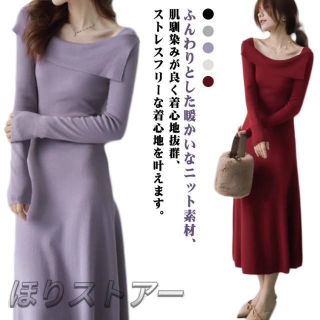 ロング丈 ニットワンピース オフショルダー 秋 おしゃれ ロングワンピース 春 ニット フレアワンピース 着痩せ ワンピース 冬 フレンチ Aライン 30代 エレガント フォーマル 20代 長袖 40代 50代 S M