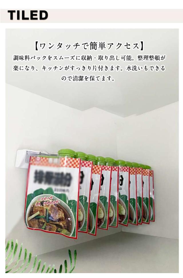 | 【ワンタッチで簡単アクセス】 調味料パックをスムーズに収納・取り出し可能。整理整頓が楽になり、キッチンがすっきり片付きます。水洗いもできるので清潔を保てます。 【衛生的なPP素材】 滑らかな表面加工のポリプロピレン製。汚れてもサッと拭き取れるか、簡単に水洗い可能。常に清潔なキッチン環境を維持できます。 【スパイスパック専用設計】 強力なクリップ式留め具で未使用分の鮮度を保持。60度回転可能な大容量収納で、様々な調味料パックを整理できます。 【頑丈なフック取り付け】 耐荷重に優れた強力フック付き。滑らかな壁面にもしっかり固定可能。厚みのある頑丈な作りで長期間安心してお使いいただけます。 【マルチユース収納ラック】 調味料以外にも、食品保存袋やスナック類の整理にも。レストラン・食品倉庫・洗面所など、様々なシーンで活用できます。 | |