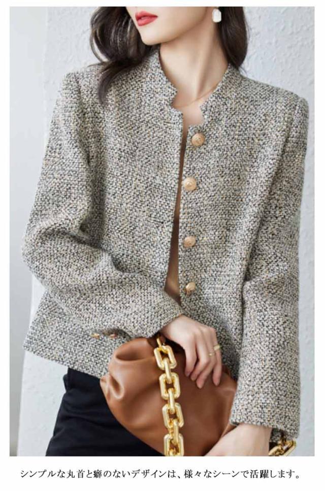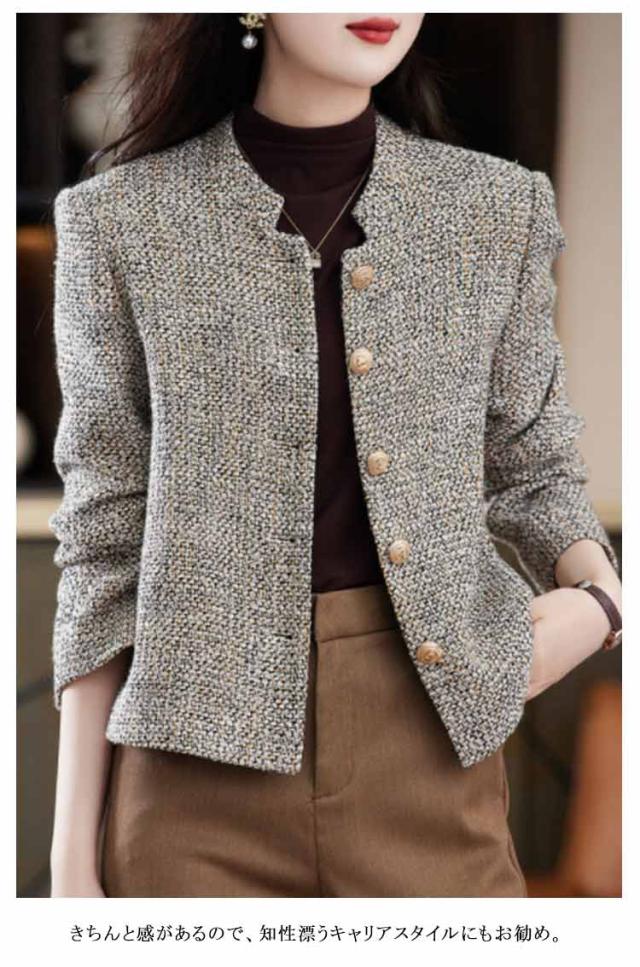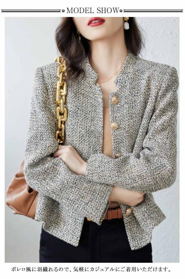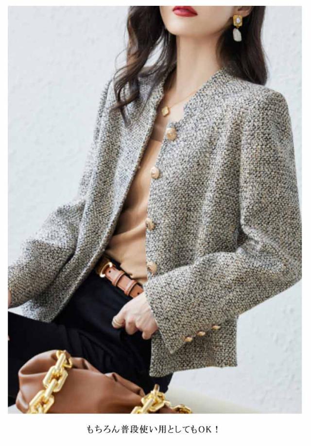 春秋 アウター ジャケット レディース 結婚式 羽織り ゴールドボタン ノーカラージャケット 前開き 通勤 オフィス オケージョン ツイードジャケット