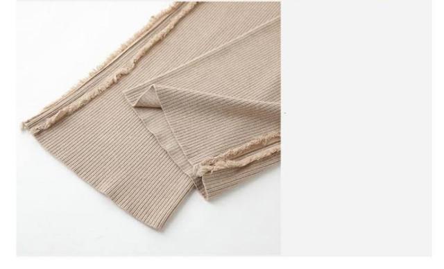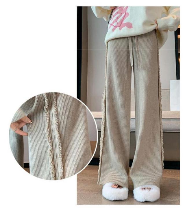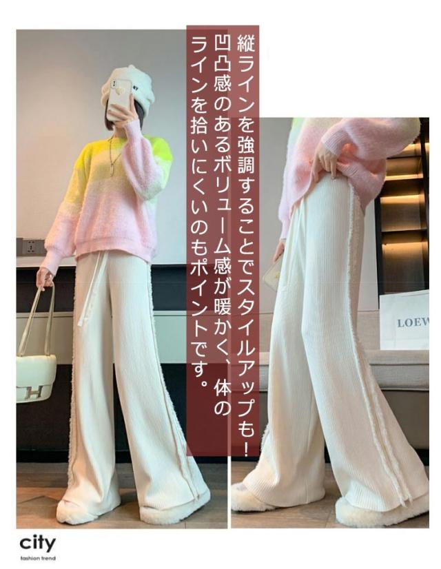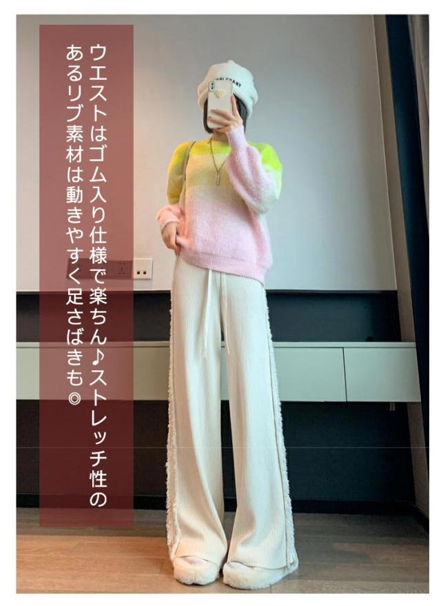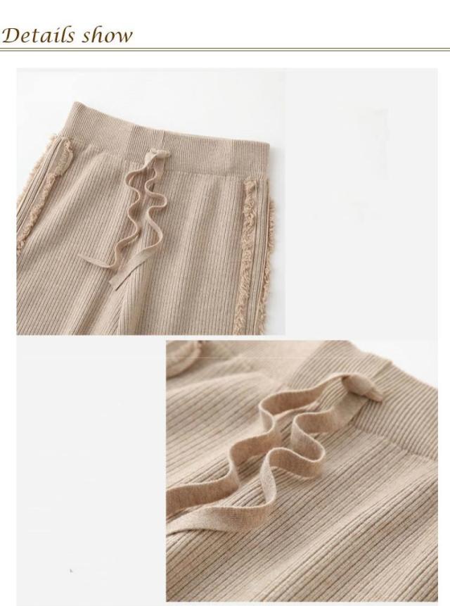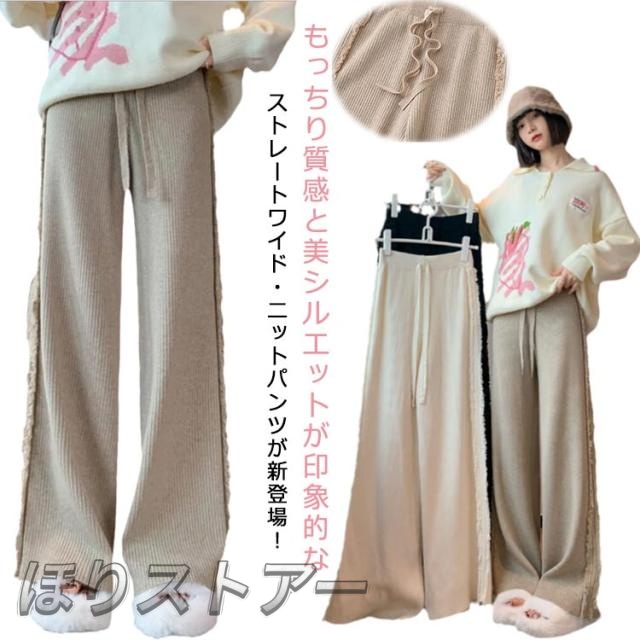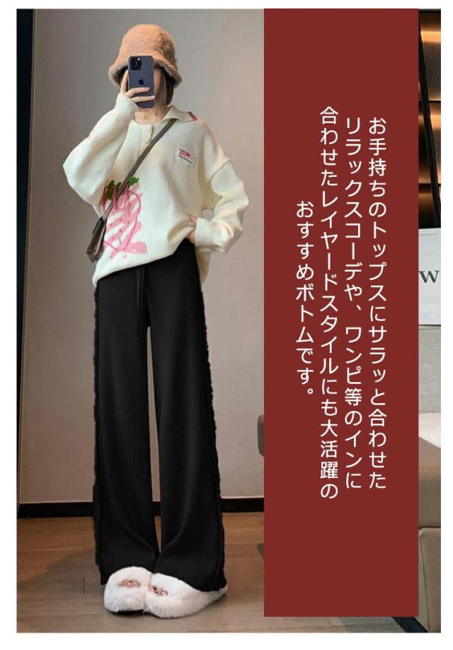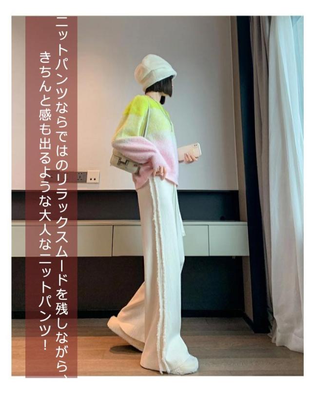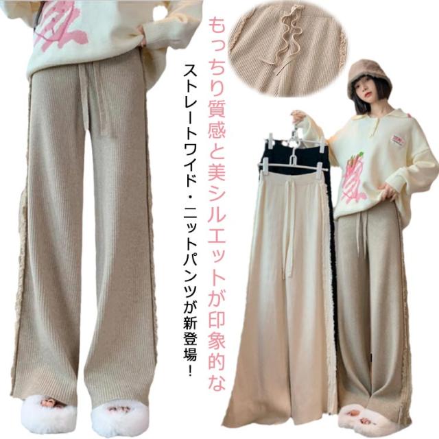 楽 フリンジニットパンツ レディース ゆったり ワイド ニットパンツ 春新作!ワイドパンツ 送料無料 ストレート ボトムス サイドフリンジ ハイウエスト イージーパンツ ストレートパンツ ウエストゴム 暖か 柔らかい ストレッチ リブパンツ