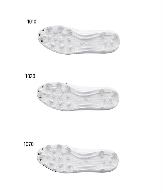 前足部のスタッドで突き上げを緩和し、外側配置のスタッドが安定感を生むブロックソール。