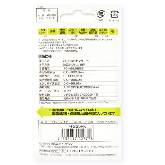 万歩計 デイリーパートナー ピンク DRETEC 歩数計 大画面表示 消費カロリー 脂肪燃焼量 歩行距離 エクササイズ 3Dセンサー搭載 軽量コンパクト 30日メモリー付 高齢者にも最適 運動 見やすい 筋トレ 歩数