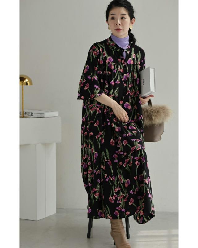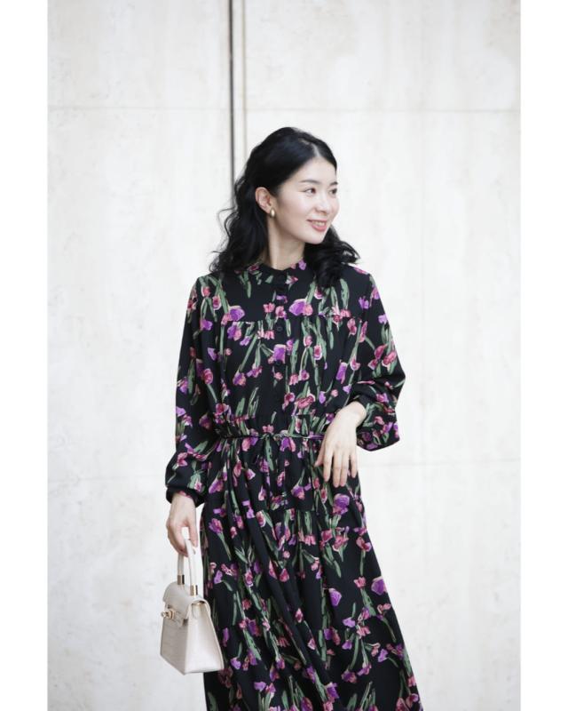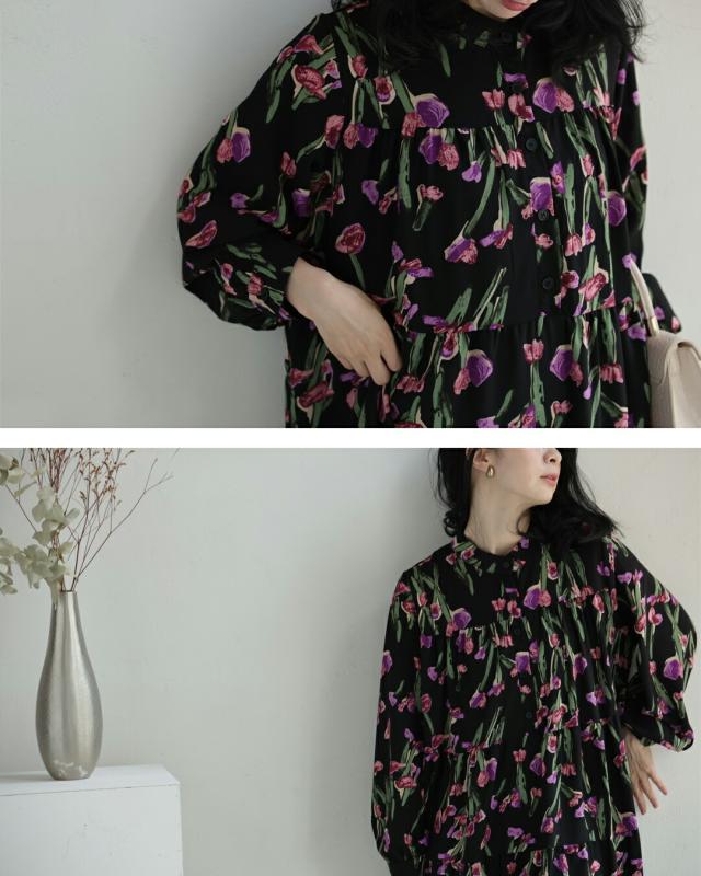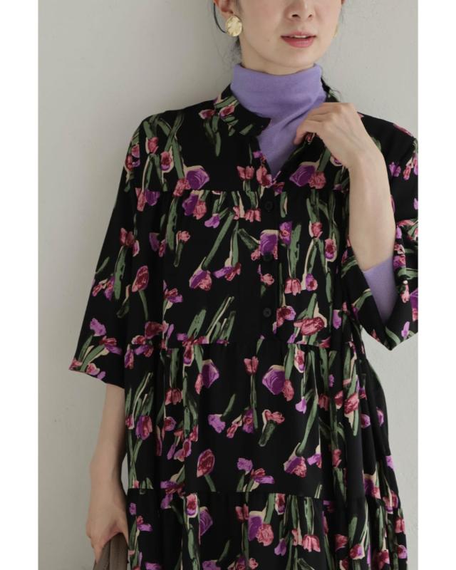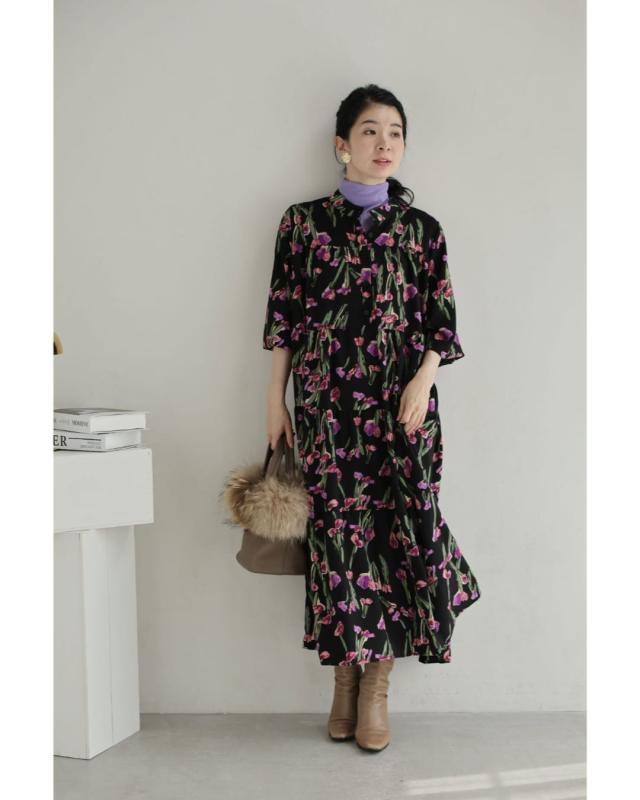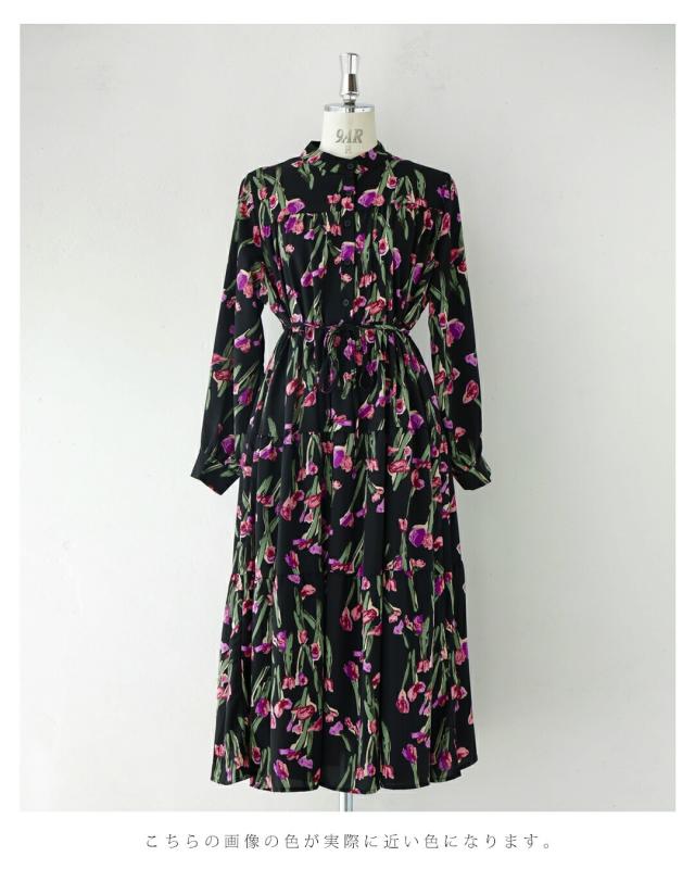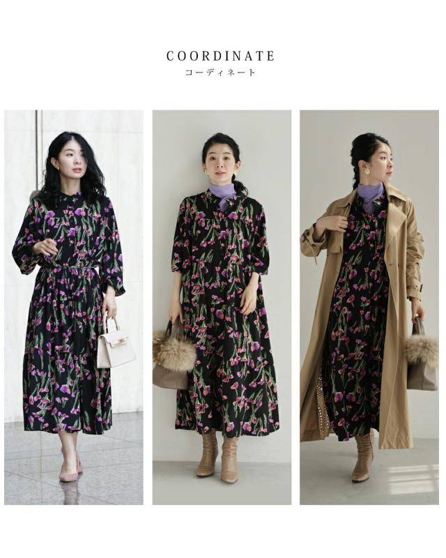 w50557nc 新作 新着 再入荷 CAWAII FRENCHPAVE フレンチパヴェ エレガント ベーシック カジュアル 可愛い かわいい カワイイ おしゃれ オシャレ お洒落 個性 個性的 定番 ベーシック 大人かわいい 大人可愛い 上品 女性らしい デザイン スタンダード ナチュラル きれいめ キレイめ シンプル フェミニン レディース レディースファッション 大人 ママ ミセス 30代 40代 50代 60代 紫色 花咲く クラシカル レディ ミディアム ワンピース 紐ベルト付き スタンドカラー 長袖 ロング袖 ティアード ふんわり 脚長見え効果 ウエストマーク メリハリ S M L 2L XL フリーサイズ フリー 小さめ 小さいサイズ 低身長 痩せ ほっそり 小柄 細身 標準サイズ 大きめシルエット 大きい 大きめ ビッグシルエット ゆったり F サイズ自由 春 秋 冬 春服 春物 秋服 秋物 冬服 冬物 体型カバー 楽ちん 楽チン ラク ブラック 黒色 花柄 フラワー柄 総柄 ガーデン 日常着 普段着 日常使い おでかけ 旅行 女子会 食事会 デート 買い物 大人女子