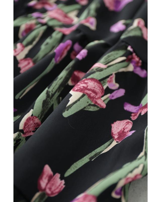 再入荷12月19日 紫色の花咲くクラシカルレディミディアムワンピース(紐ベルト付き)cawaii w50557nc S~2L対応 長袖 ティアード 総柄 ブラック オシャレ 個性的 エレガント 上品 春 秋 冬 レディース ファッション ミセス 30代 40代 50代