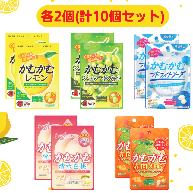 かむかむレモン パウチ 最短賞味期限2026年11月 5種セット 各2個 計10個 レモン シャインマスカット ホワイトソーダ 赤肉メロン 清水白桃 まとめ買い セット かむかむ カムカム パウチタイプ マスカット ソーダ 炭酸 キャンディー キャンディ チューイングキャンディ
