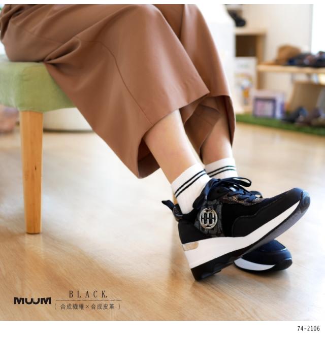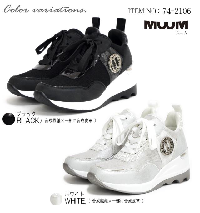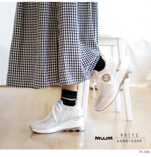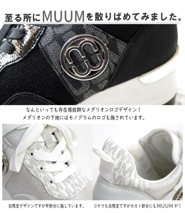 スニーカー レディース きれいめ 厚底 白 黒 歩きやすい 紐 ファスナー ミドルカット 軽い MUUM ムーム メダリオン ウエッジソール ラウンドトゥ オリジナル モノグラム ロゴ 3e