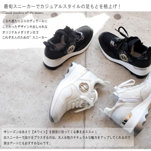 ラグジュアリーに輝く、厚底スニーカー!上品な光沢素材とメタリックアクセントを取り入れた大人スニーカー。サイドのエンブレムデザインが華やかさをプラスし足元を主役に引き立てます。