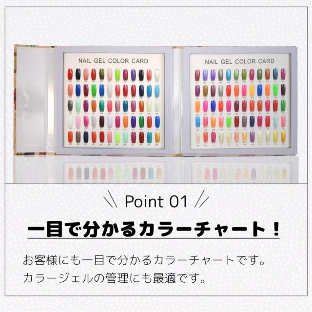 120枚の専用チップが付いたネイルカラーチャートブックです。 point1 一目で分かりやすくカラージェルの管理に最適! point2 テープ不要!いつでも取り出し可能 point3 持ち運びにも便利なブック型! |
