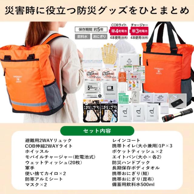避難用2WAYリュック、COB伸縮2WAYライト、ホイッスル、モバイルチャージャー(乾電池式)、ウェットティッシュ(20枚)、軍手、使い捨てカイロ×2、防寒アルミシート、レインコート、携帯トイレ(大小兼用)1P×3、ポケットティッシュ×2、エイトバン(大小×各2)、防災ハンドブック、長期保存ボディタオル、携帯おにぎり(鮭)、携帯おにぎり(昆布)、備蓄用飲料水500?、マスク×2