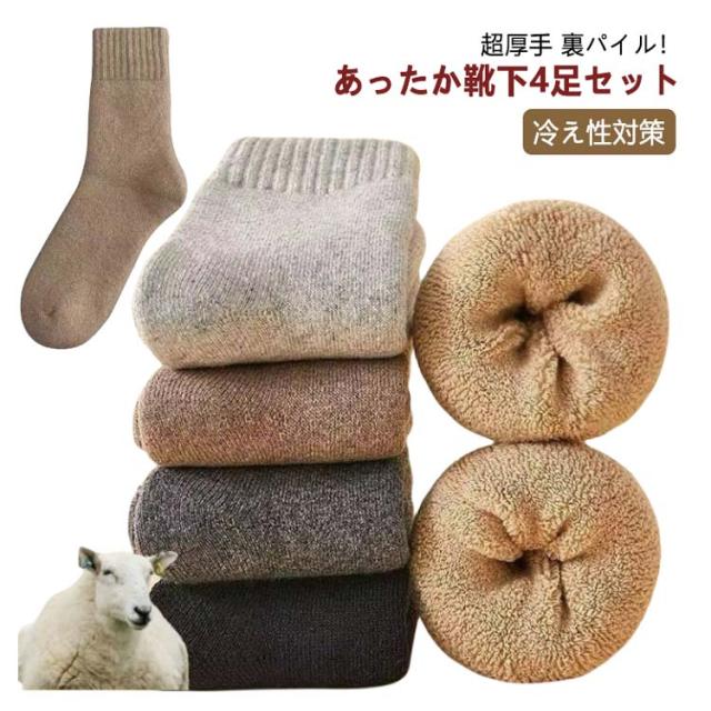 極暖 ソックス メンズ レディース 4足セット ウール ウールソックス 厚手 裏パイル 靴下 暖かい 防寒 ロングソックス 男性用靴下 男女兼用 防寒 くつ下 秋 冬 春用 靴下 対策 あったか 靴下 クルーソックス ルームソックス 通勤 通学 アウトドア 登山 キャンプ