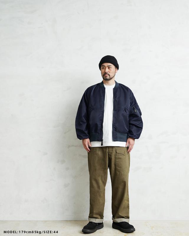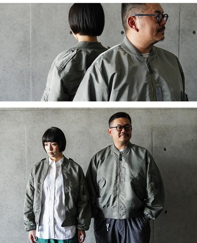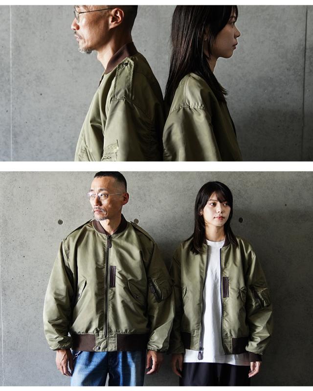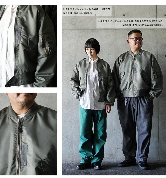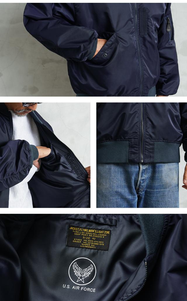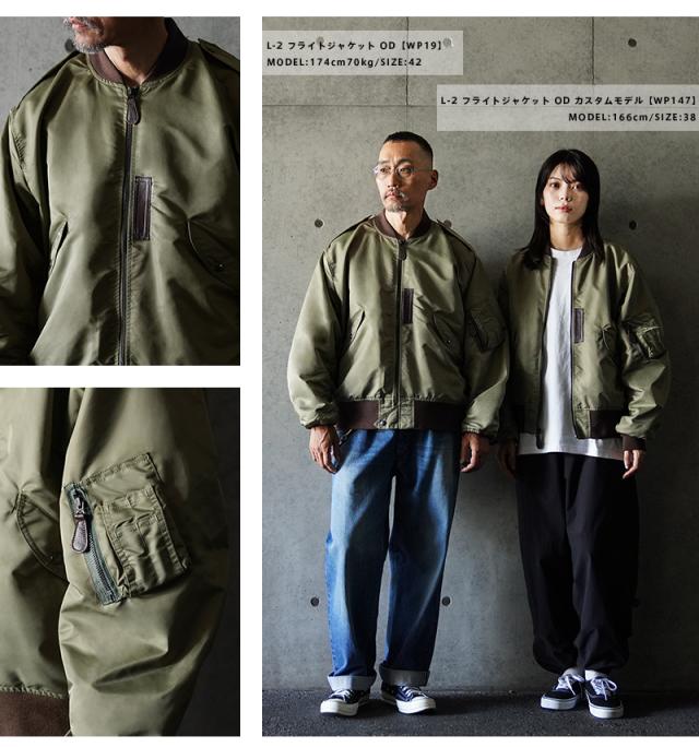 1945年にA-2の後継として登場したL-2は、ライト・ゾーン(10℃〜30℃)と呼ばれる温度域での着用が想定された軽量なフライトジャケット。MA-1など一般的なフライトジャケットは防寒用の中綿が詰まっているのに対し、ゴワつきの無いスッキリとしたシルエットが特徴です。