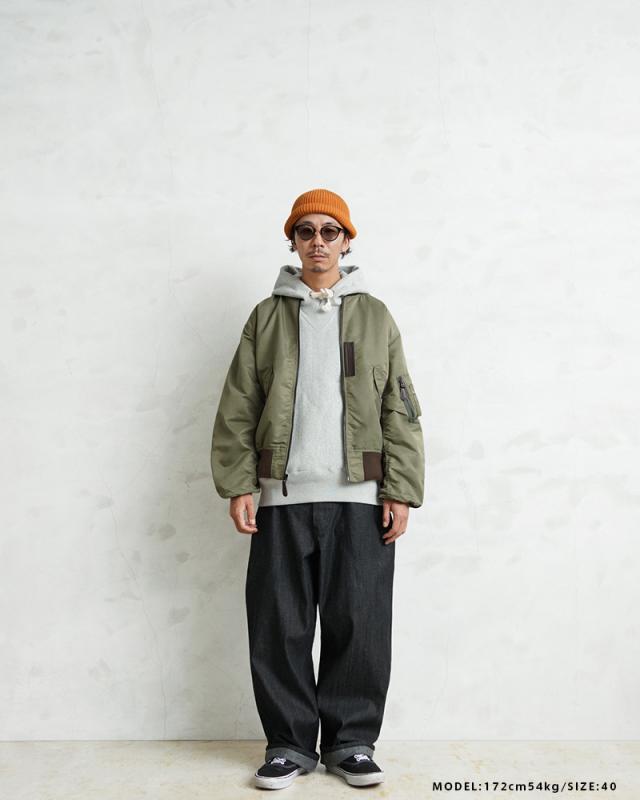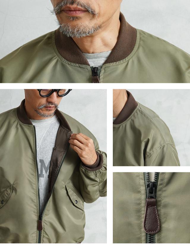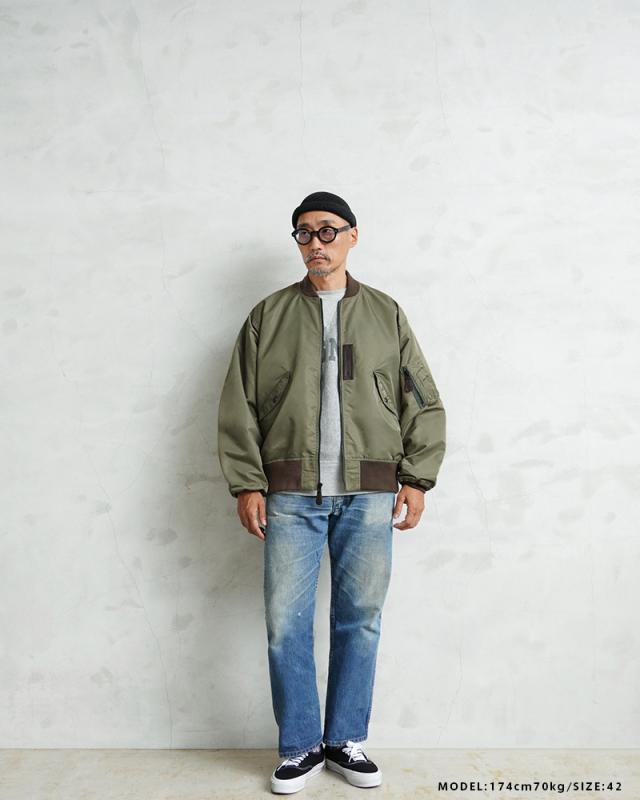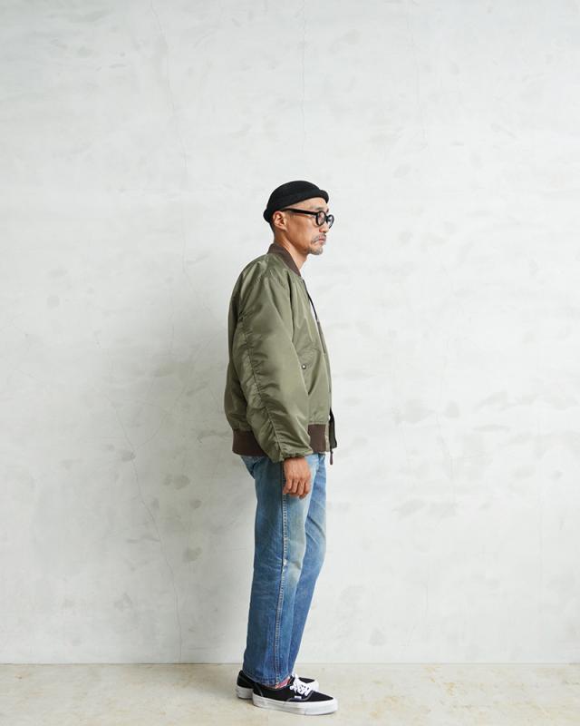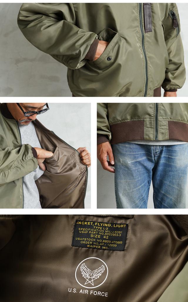 1945年にA-2の後継として登場したL-2は、ライト・ゾーン(10℃〜30℃)と呼ばれる温度域での着用が想定された軽量なフライトジャケット。MA-1など一般的なフライトジャケットは防寒用の中綿が詰まっているのに対し、ゴワつきの無いスッキリとしたシルエットが特徴です。1978年に新たに採用されたCWU-36/Pの登場まで、幾度もマイナーチェンジを重ねた息の長いジャケットです。