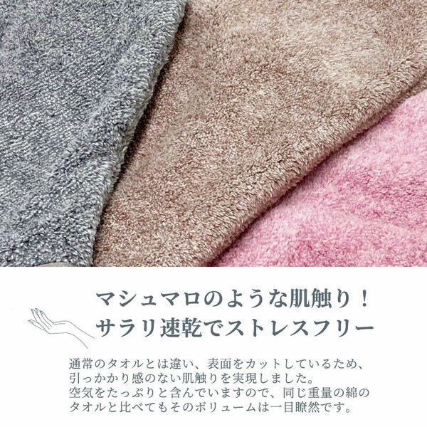 約34×90cmのゆったりサイズで、1枚で全身の水分をしっかり吸収 髪の毛より細い繊維が水分をすばやくキャッチし、ドライ時間も短縮 表面のパイルを丁寧に刈り取ることで、なめらかでふわふわな肌ざわりを実現 |