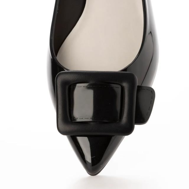 美しいシルエットのポインテッドパンプスに大きめのバックルベルトがアクセント。