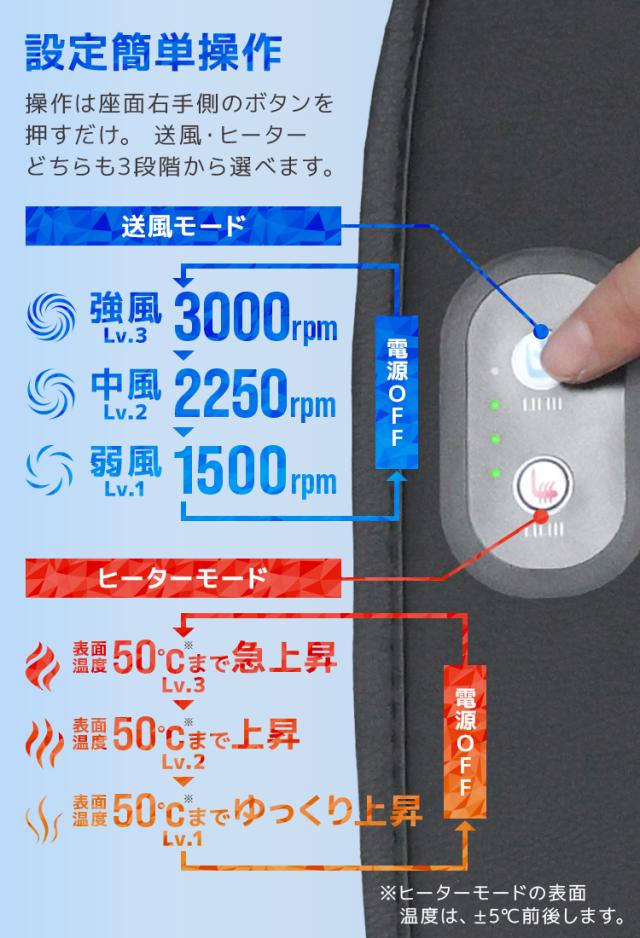 ファンの強力送風とメッシュ生地により、冷房が当たらない箇所も涼しく夏でも快適!