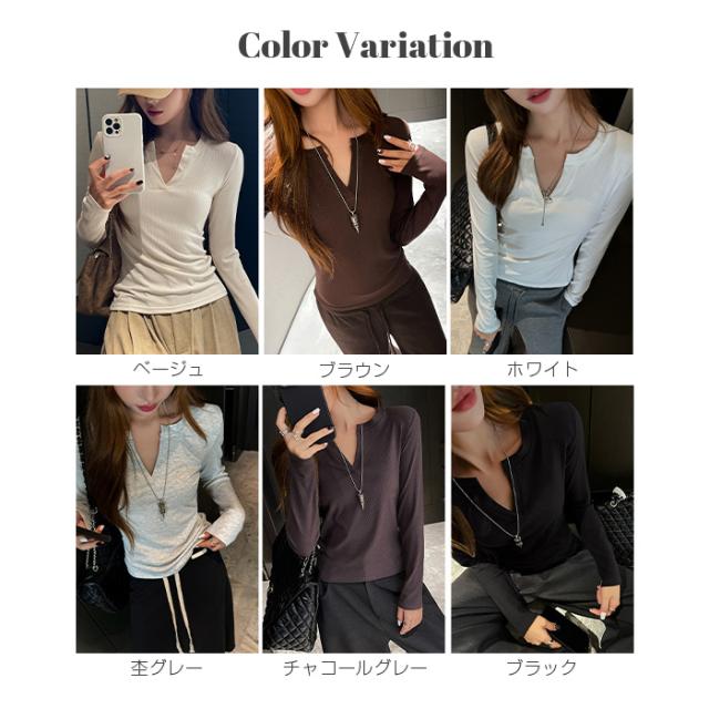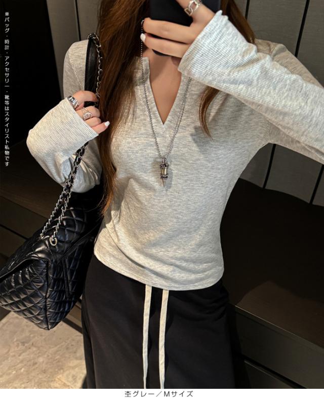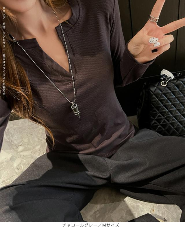 50%OFFクーポン対象!Tシャツ ロンT 長袖 カットソー トップス レディース リブ インナー 秋 ベージュ ブラウン 白 杢グレー チャコールグレー 黒 Mサイズ Lサイズ XLサイズ【キーネックリブロンT】ダークエンジェル 春新作