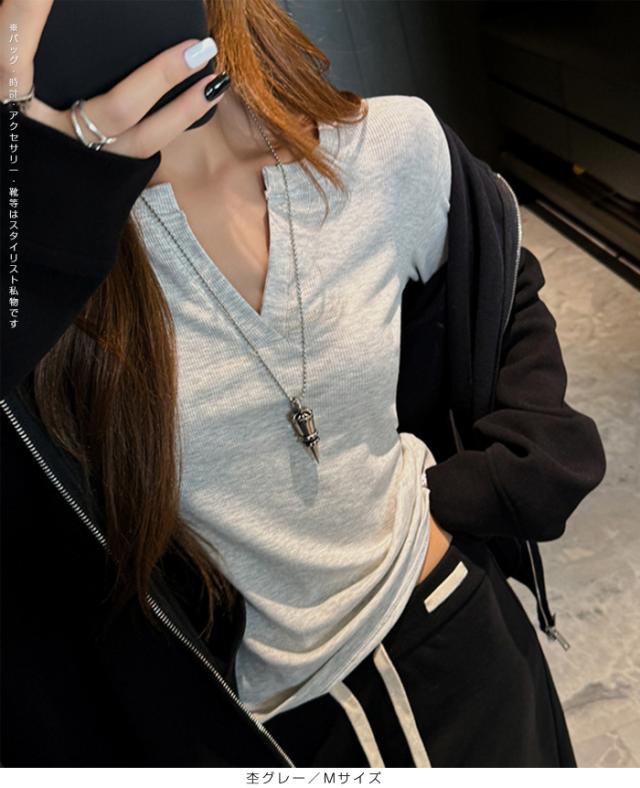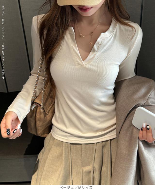 シンプルながらも大人の抜け感を演出してくれるキーネックデザインのリブトップス。