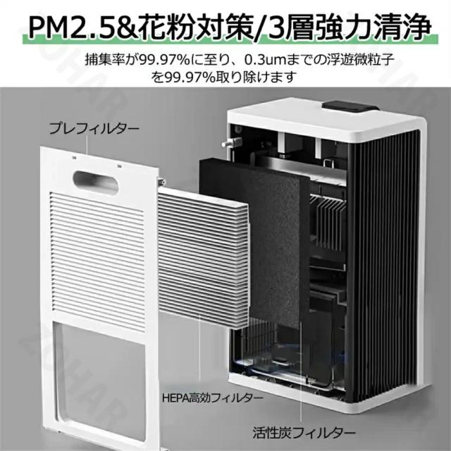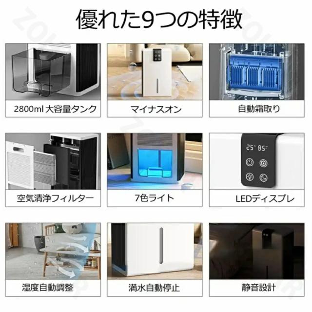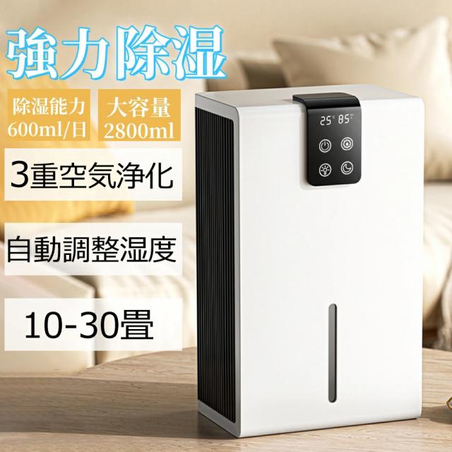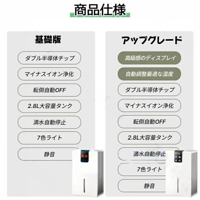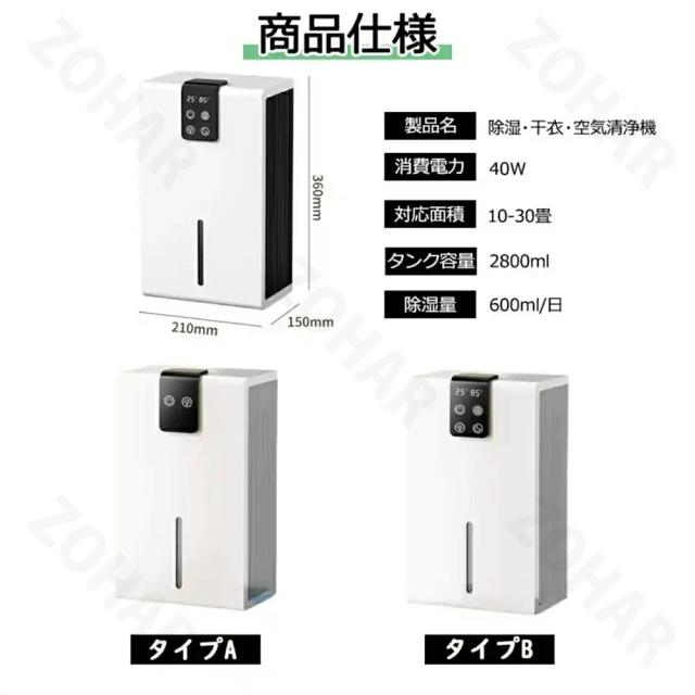 210x150x360mm ●重量(約):3KG ●定格消費電力:40w ●空焚き防止、満水提示 ●適用面積:10−30畳 ●推奨使用環境:温度15〜40℃、湿度45〜90% ●タンク容量:約2.8L ●動作音:43dB以下 保証期間:2年間 ●2800mlのタンクを搭載され、一日600mlぐらいの水気を吸収できます。