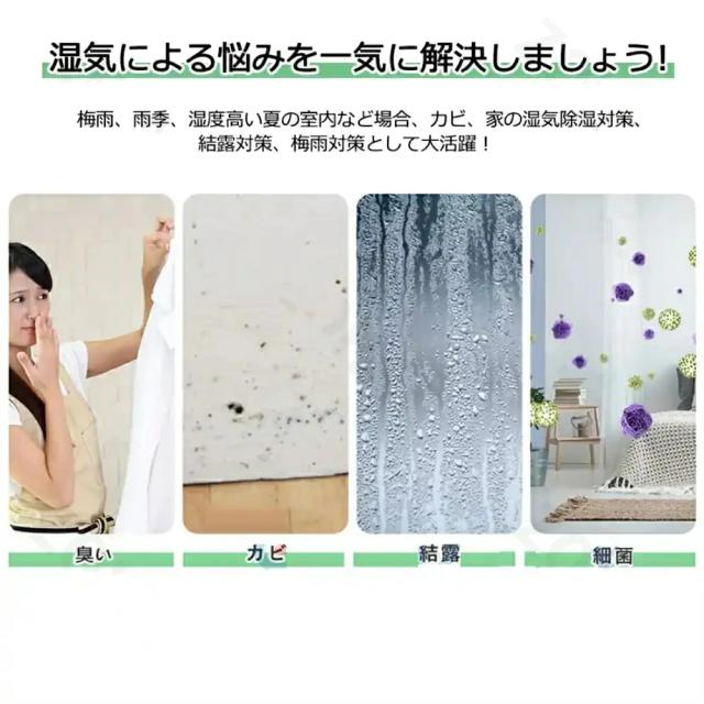 | 【使い方さまざま】 | 梅雨のジメジメ解消、押入れ・クローゼットの湿気対策、浴室やトイレのカビ対策などにも。 |