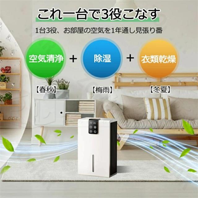 | 【一台3役 オールシーズン適用】 | 除湿・干衣・空気清浄の3役をこの1台で果たす除加湿空気清浄機です。さらに除湿機能を利用した衣類乾燥や部屋干しにも。 |
