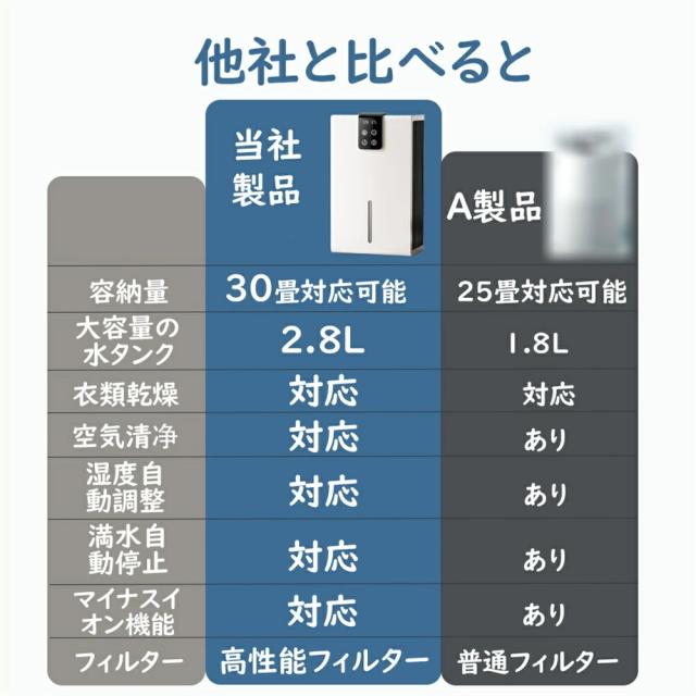| 【抜群の除湿力】 | 2800mlのタンクを搭載され、一日600mlぐらいの水気を吸収できます。 |