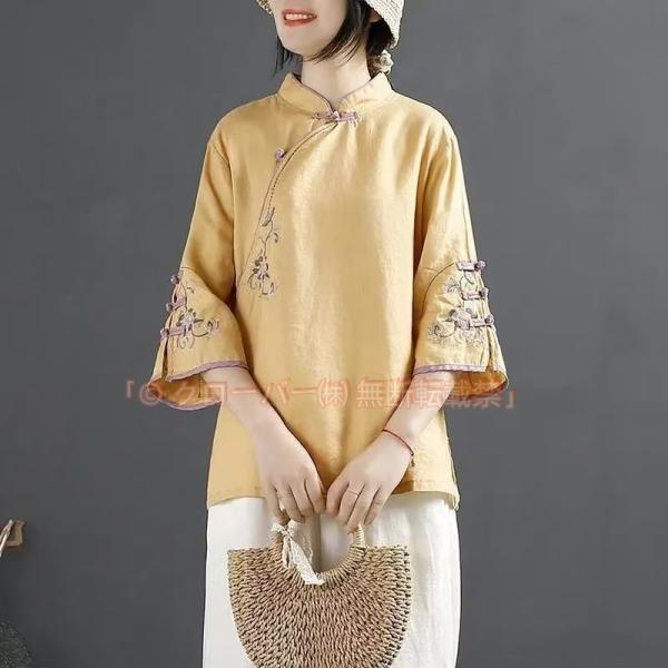 チャイナ チャイナ風 ブラウス チャイナシャツ 花柄 薄手 リネンブラウス クローバー株式会社 綿 麻 レディース ナチュラル チャイナカラー プルオーバー チャイナボタ