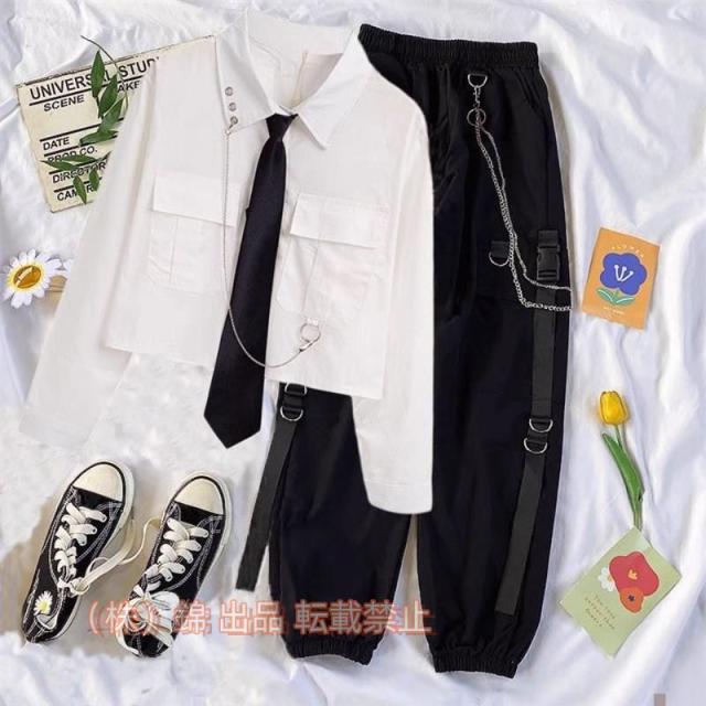 シャツ半袖/長袖レデイーズ原宿風JK制服ショート丈へそ出しトップス韓国ファッションヒップホップダンス衣装株式会社錦ストリート系春秋ネクタイ付き