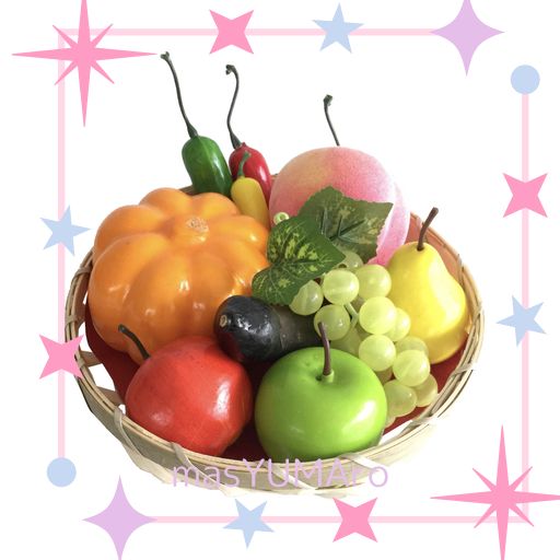 内容・サイズ:かぼちゃ/約Φ9×5cm ナス/約Φ2.5×10cm、ししとう×3/約Φ2×10,約Φ1.5×5.5cm、りんご×2/Φ5×5cm、ぶどう/約Φ4×10cm、洋梨/約Φ4×5.5cm、もも/約6.5×6.5cm、竹篭/約Φ19×4cm