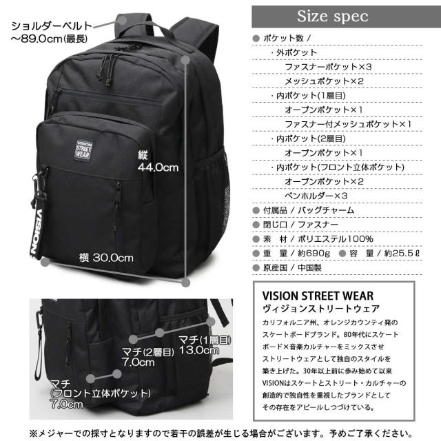 ヴィジョンストリートウエア(VISION STREET WEAR)/大容量 2層式 スクエアバックパック サイドメッシュポット付き A4 B4収納対応