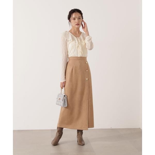 厚手ながら柔らかいダンボール素材を使用したフェイクスエードスカートです。ラップ見えシルエットがキレイなナローシルエットを演出。ゴールドカラーの釦が引き立つ大人っぽいデザインです。同素材のブルゾンとのセットアップスタイルもお勧めです。