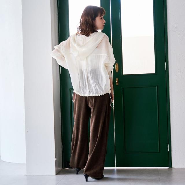 トレンド感のあるベロア素材を使用したワイドパンツ。