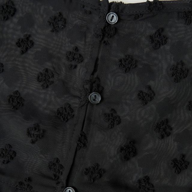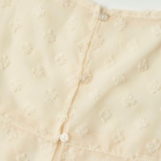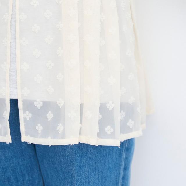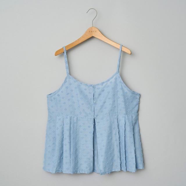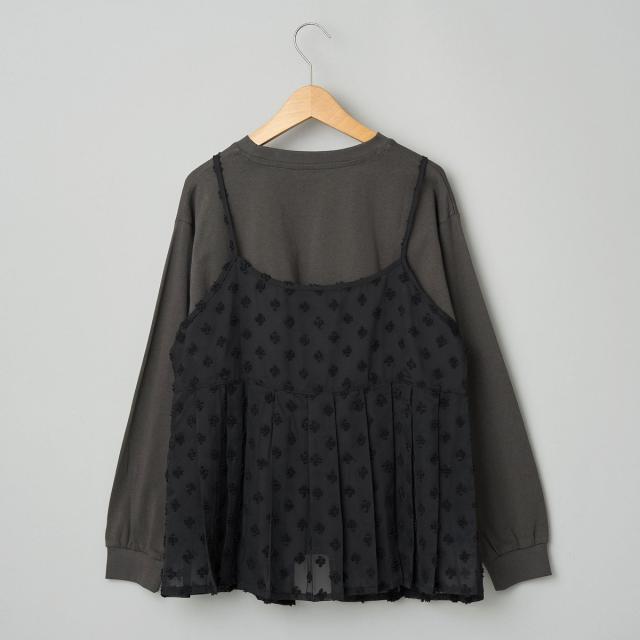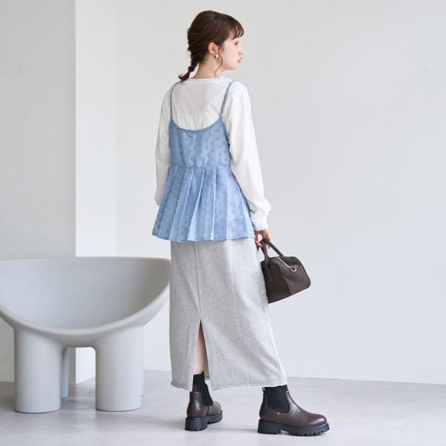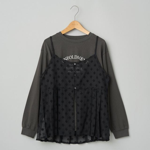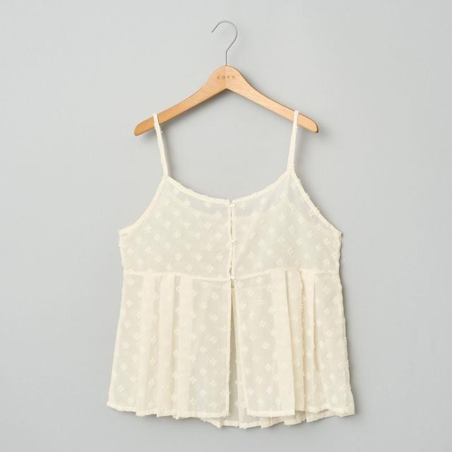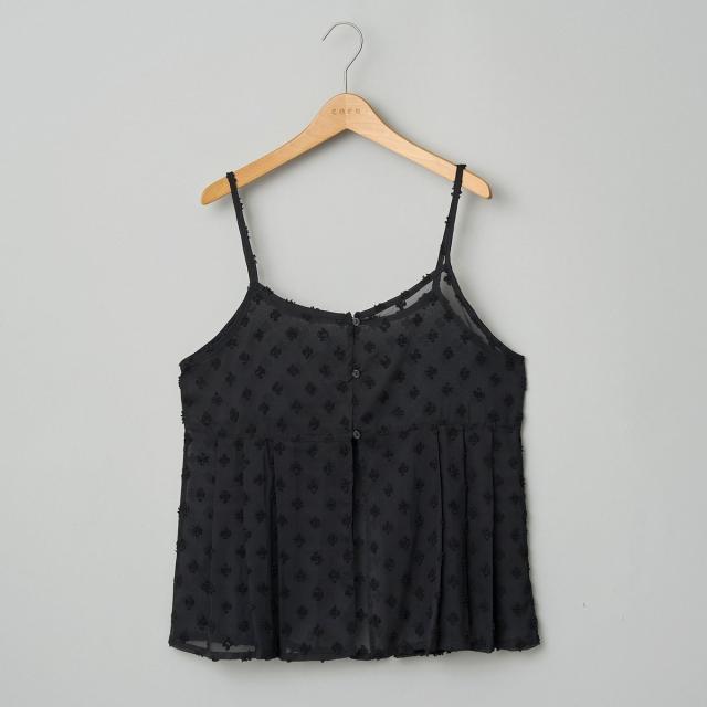キャミソールは透け感のあるドット柄シフォンで、重ねるだけでスタイリングに華やかさをプラス。