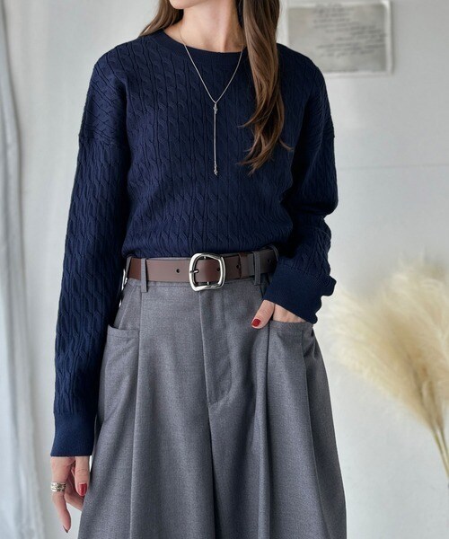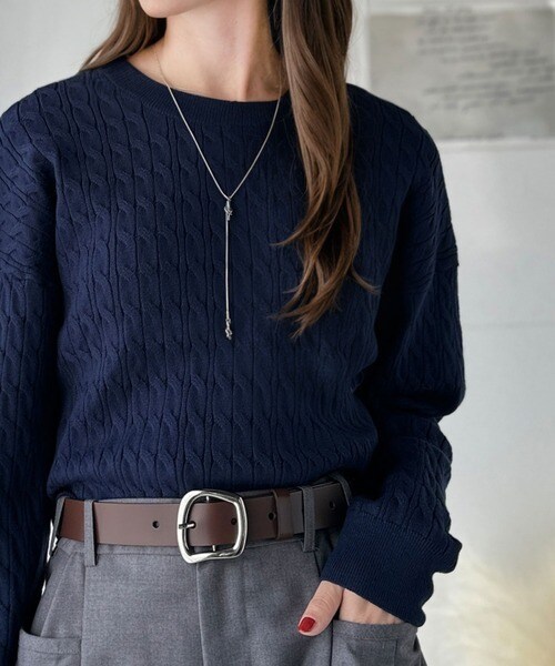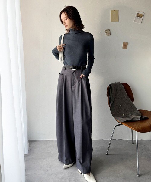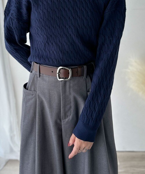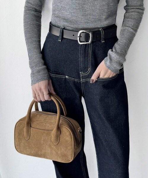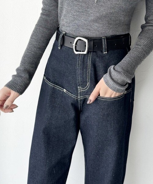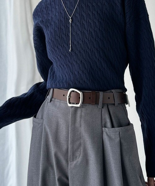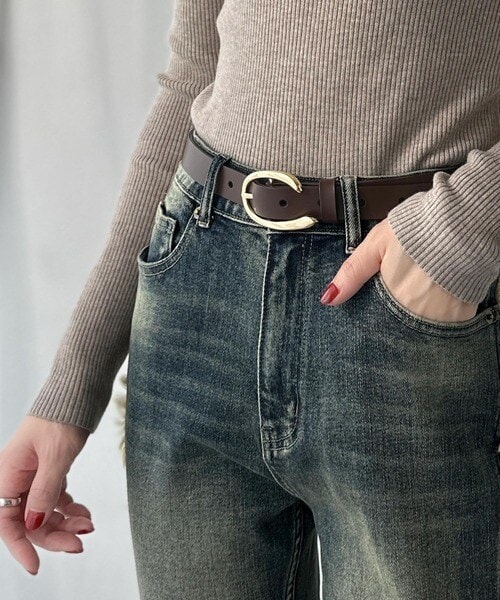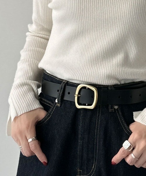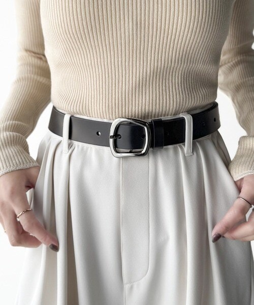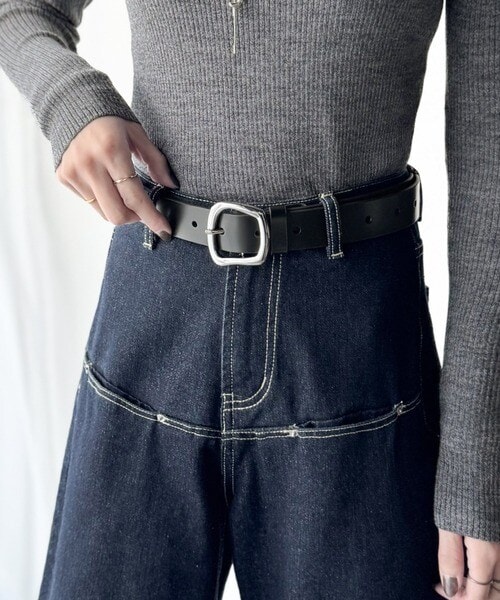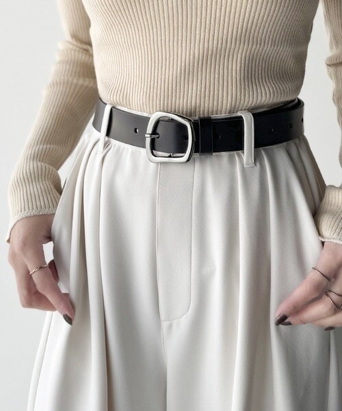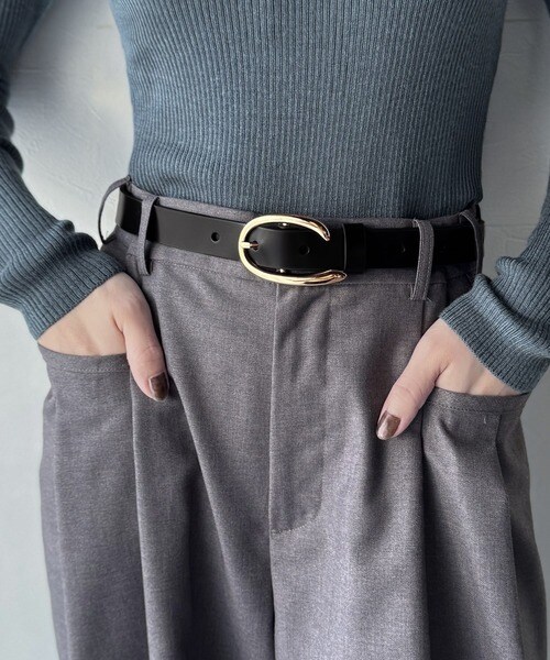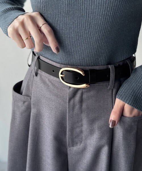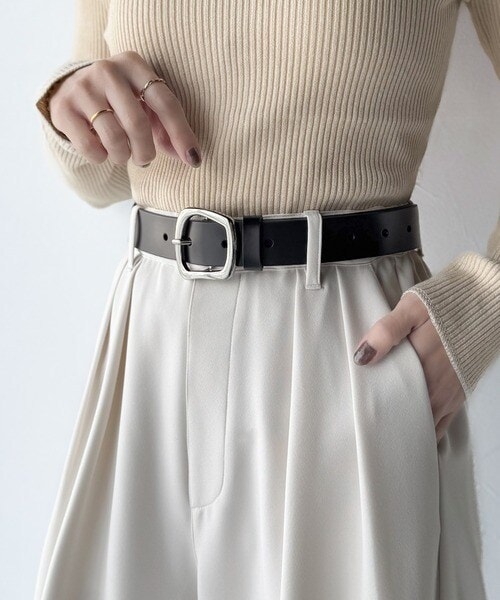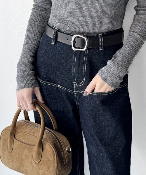 トップスをインしたスタイリングで、バックルのデザインが映える着こなしに。
