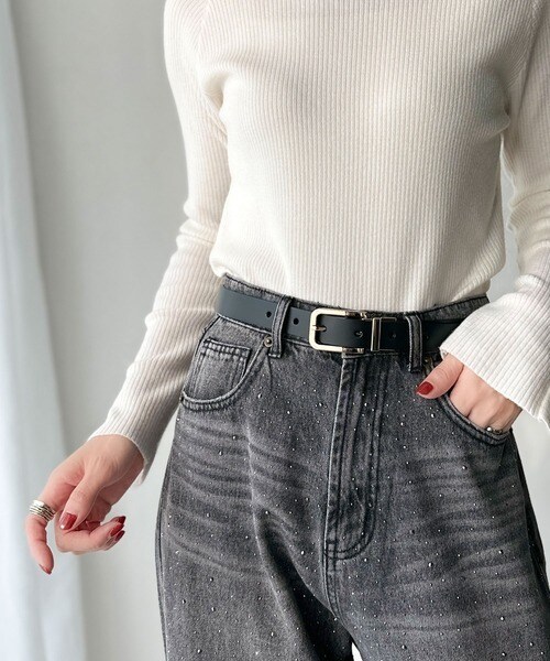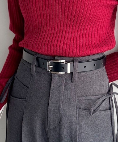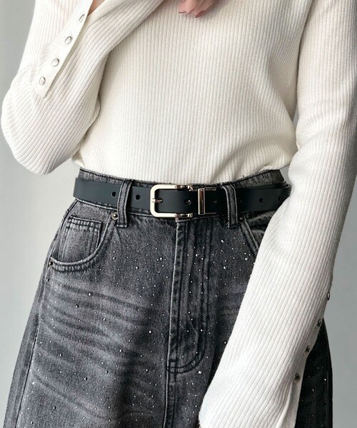 トップスをインしたスタイリングで、バックルのデザインが映える着こなしに。