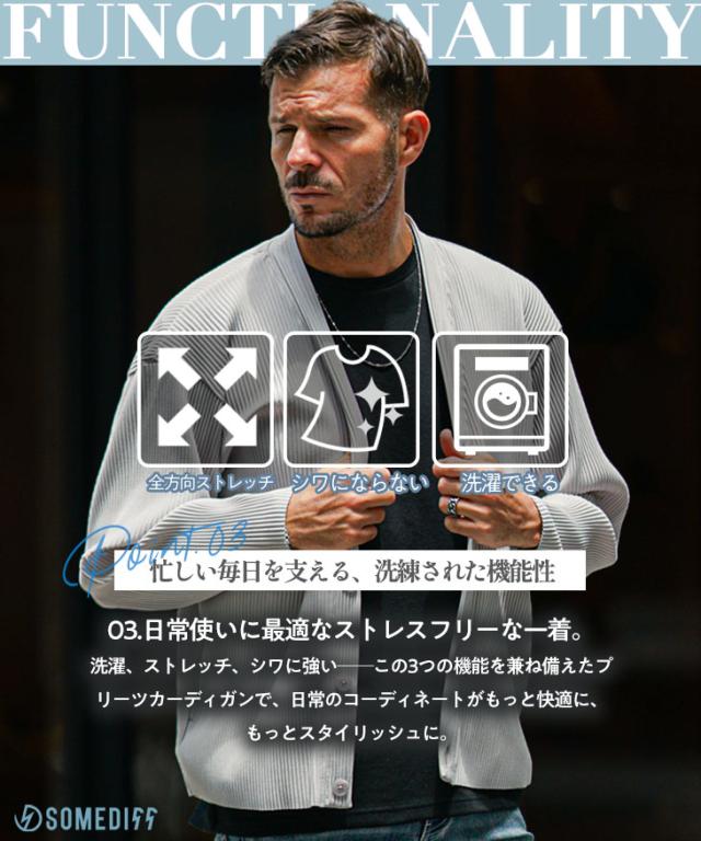 SOMEDIFF(サムディフ)『プリーツカーディガン』【プリーツカーディガン】■Design / デザイン羽織るだけで差がつく、プリーツ素材のカーディガン。表面に立体感のあるプリーツ加工を施した生地を使用し、しっとりとした上質な質感で、羽織るだけで存在感を放つ一枚。ジャスト丈ながら、ほんのりオーバーサイズのシルエットで、リラックス感と大人の余裕を演出。フロントにはボタンを4つ配置し、着こなしに応じてアレンジ可能です。さらに両サイドのポケットが実用性をプラス。凹凸のあるプリーツ生地は肌離れがよく、軽やかな着心地を実現。一般的なカーディガンにはない“涼しさ”と“品の良さ”を感じられます。シンプルながらも個性を引き立てる、大人のためのリラックスカーディガンです。
