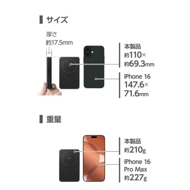 ●Qi2対応iPhoneにマグネットで取り付け、最大15Wでワイヤレス充電できるモバイルバッテリーです。