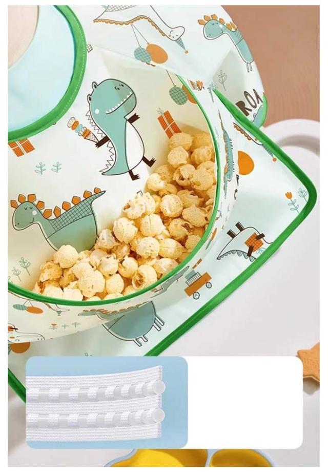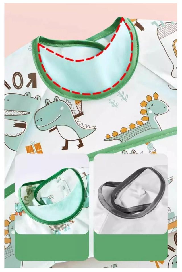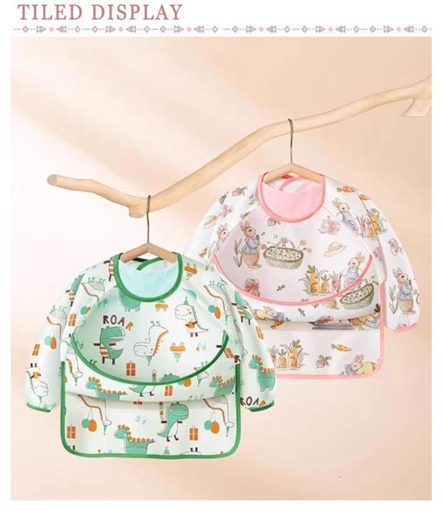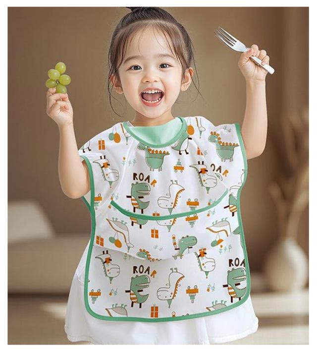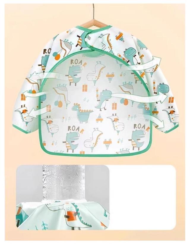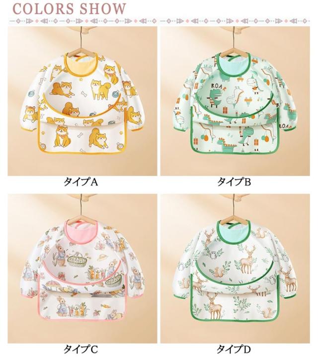 | おしゃれな長めのエプロン,ポケット付きで洋服も汚れず、床に落ちるのも防ぎ、掃除やお洗濯がとっても楽です! 袖のよだれかけ全体が防水で、防水性に加えて、汚れ、臭いにも強い。 袖付きなので、汚しやすい袖部分を手首までカバーしてくれるから、保育園や幼稚園で大活躍◎ | |