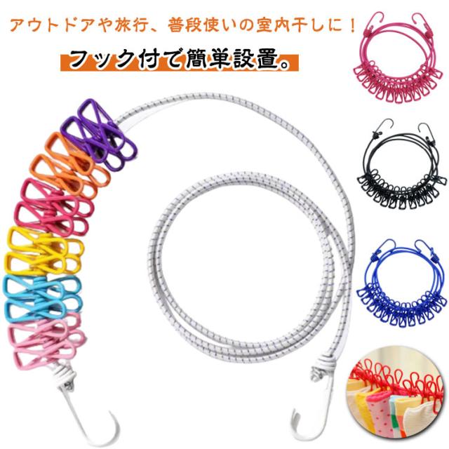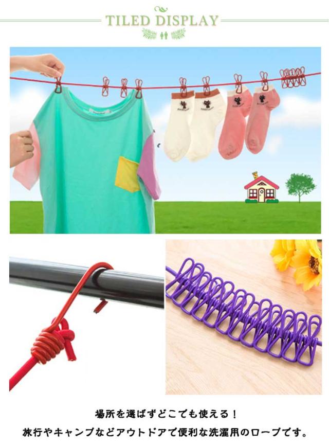 | アウトドアや旅行、普段使いの室内干しに!フック付で簡単設置。 絡まりにくく、挟みやすいクリップ12個付きで利便性も抜群。 ロープにはストッパー付きでクリップの間隔を調節できます。 場所を選ばずどこでも使える!旅行やキャンプなどアウトドアで便利な洗濯用のロープです。 | |