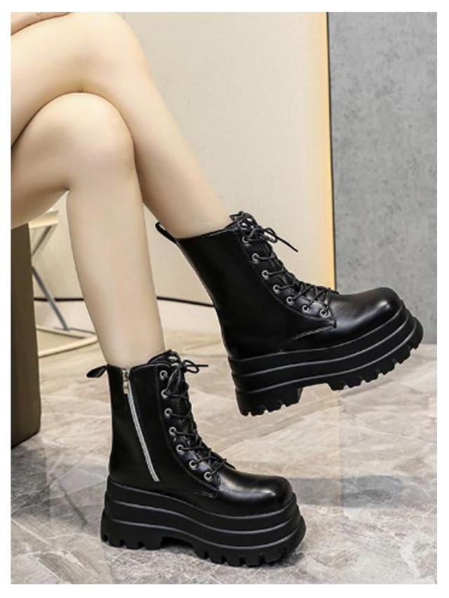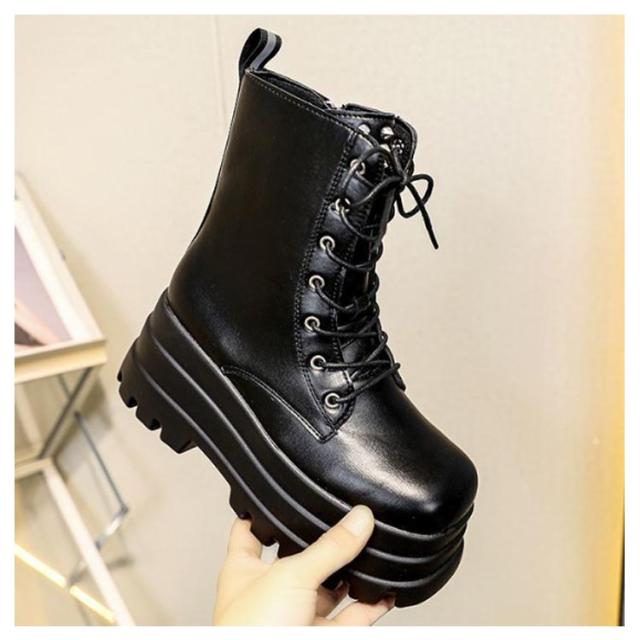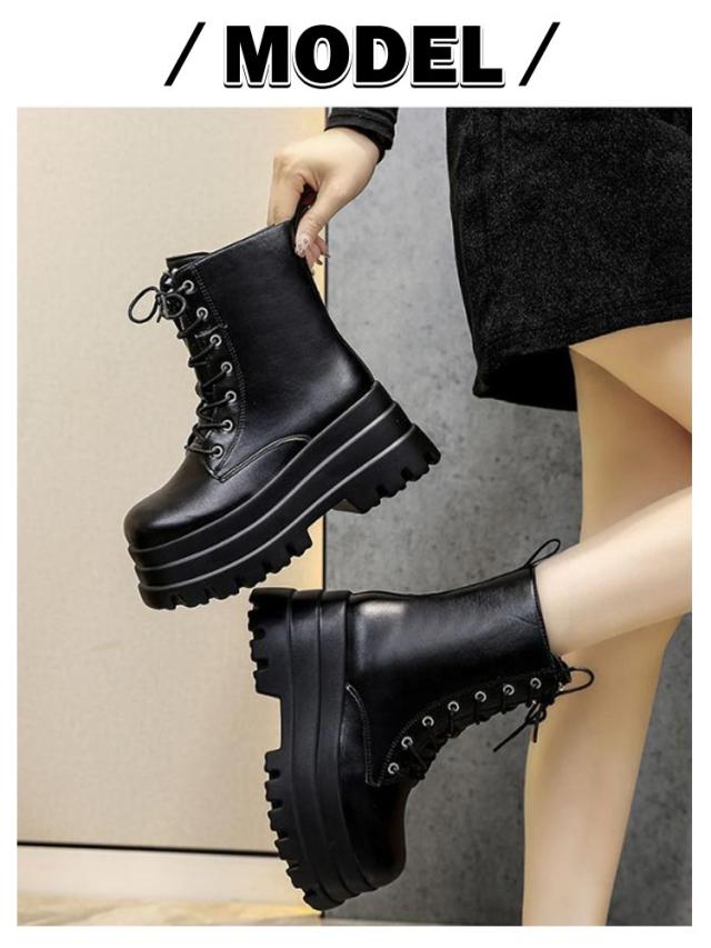 厚底ブーツ ミディアム丈 レースアップブーツ 編み上げブーツ レディース 美脚ブーツ 美脚ブーツ 厚底シューズ 歩きやすい おしゃれ ブーツ カジュアル ブラック 黒 安定感 厚底靴 かっこいい ワークブーツ 脚長効果