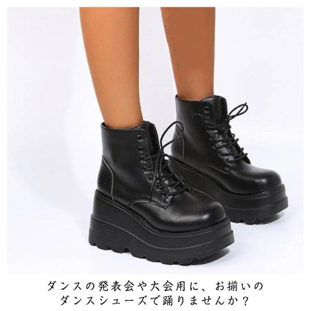 | 超厚底編み上げブーツ 厚底のデザインは体重をしっかりと支えてくれるので、安定感がさらに増し、旅行などで長時間歩いても疲れにくいです。 合皮だから多少の雨や水濡れなら気になりません。 少しの汚れならサッと拭けばキレイになって、お手入れらくちん! 10cmアップ!美脚効果抜群。コスプレの衣装やハロウィンの仮装、そしてダンスの衣装にも◎ ダンスの発表会や大会用に、お揃いのダンスシューズで踊りませんか? | |