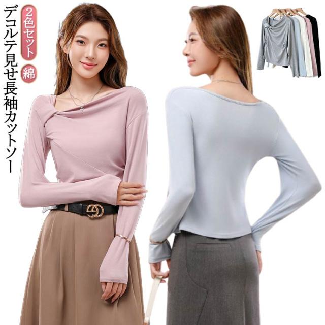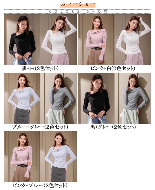 2色セット デコルテ レディース ねじりデザイン トップス Tシャツ 見せ ツイスト カットソー 綿 コットン デザイン おしゃれ きれいめ 2色セット プルオーバー