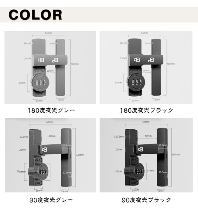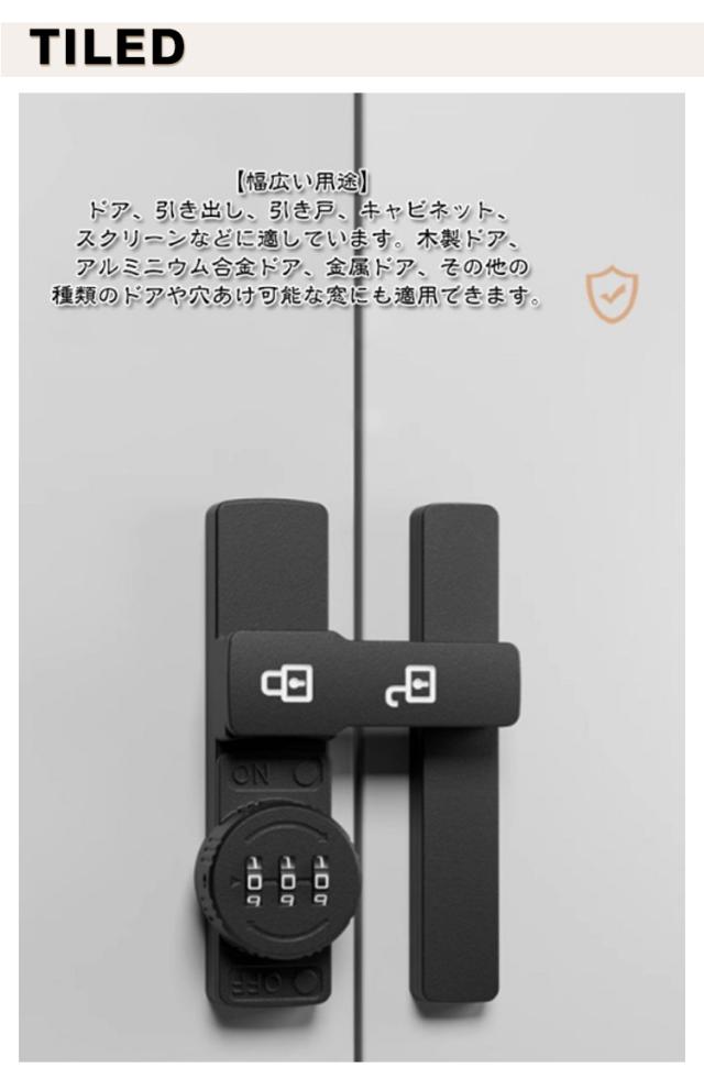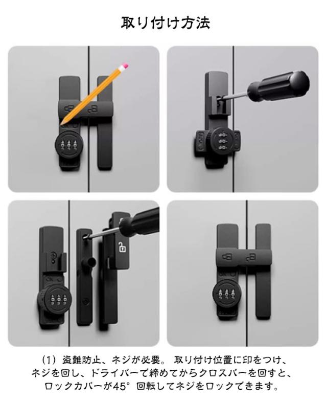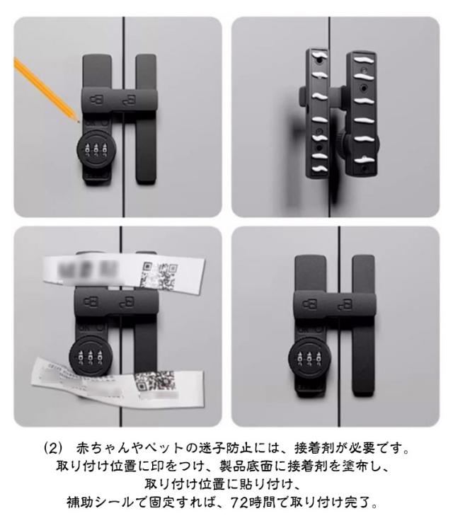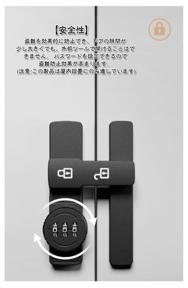 | 90度・180度選べる! 3桁ダイヤル後付けドアロック 7color 【高品質素材】製品は強くて耐久性のある亜鉛合金でできており、変形しにくく、防湿性と防錆性があります。 【安全性】盗難を効果的に防止でき、ドアの隙間が少し大きくても、外部ツールで開けることはできません。 パスワードを設定できるので盗難防止効果が高まります。 (注意:この製品は屋内設置にのみ適しています) 【取付けも簡単】取り付け用のネジや接着剤で設置する事ができます。左または右にインストールすることを選択できます。特殊タイプで90度の角度で取り付けられるため、ドアや窓の安全を確保するために使用できます。 【安全保護】子供ケガ防止だけでなく、部屋の外に出ていかないようにしたり、様々な危険を防止できます。簡単施錠でスライドドアの防犯対策ができます。猫の脱走防止用としてもお使いいただけます。 【幅広い用途】ドア、引き出し、引き戸、キャビネット、スクリーンなどに適しています。木製ドア、アルミニウム合金ドア、金属ドア、その他の種類のドアや穴あけ可能な窓にも適用できます。 ダイヤルのパスワードは可変で、初期パスワードは0-0-0で、ピンで穴に挿入すればパスワードを変更できます。 取り付け方法 (1)盗難防止、ネジが必要。 取り付け位置に印をつけ、ネジを回し、ドライバーで締めてからクロスバーを回すと、ロックカバーが45°回転してネジをロックできます。 (2) 赤ちゃんやペットの迷子防止には、接着剤が必要です。 取り付け位置に印をつけ、製品底面に接着剤を塗布し、取り付け位置に貼り付け、補助シールで固定すれば、72時間で取り付け完了。 | |