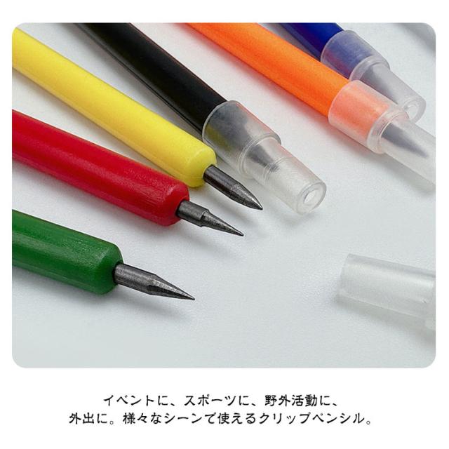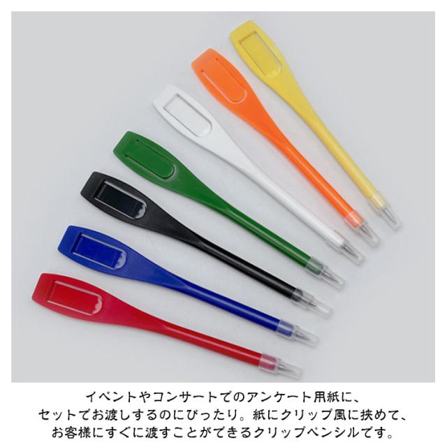 | 【クリップペンシル 100本セット 2B芯 全7色】 手軽かつ便利なプラスチック製の鉛筆です。 イベントに、スポーツに、野外活動に、外出に。様々なシーンで使えるクリップペンシル。 イベントやコンサートでのアンケート用紙に、セットでお渡しするのにぴったり。紙にクリップ風に挟めて、お客様にすぐに渡すことができるクリップペンシルです。 クリップタイプなので、紙やメモ帳、カレンダー等、いろいろなところに手軽に挟めておくことができます。 薄型なので邪魔になりません。 | |